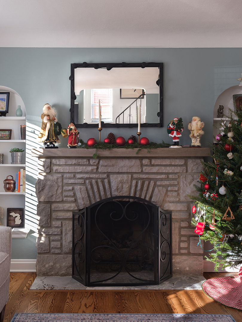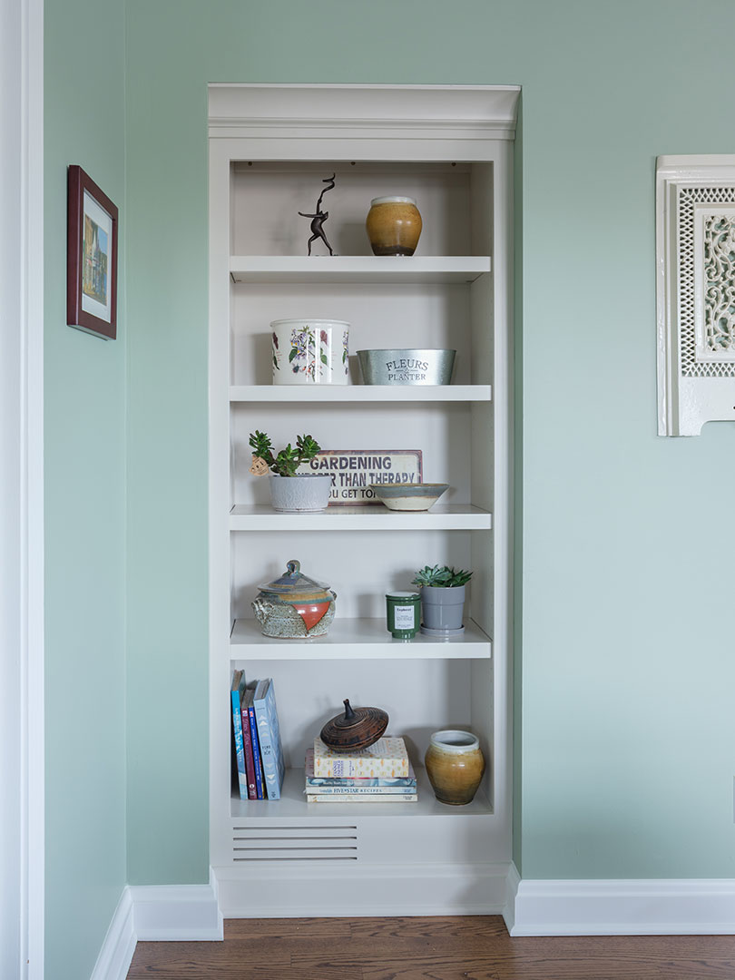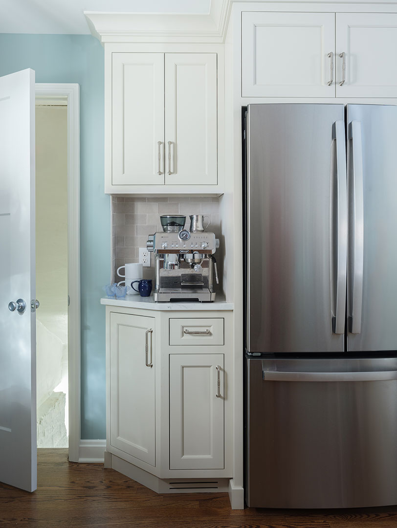 Our team reworked the layout to create a more logical and usable kitchen. The doorway between the family room and kitchen was closed to allow for an uninterrupted wall of custom cabinetry, improving both storage and visual balance. Built in shelving was added in the former doorway space of the back room, and the cabinetry was carefully designed to accommodate a small bump out left by the range without compromising the layout. A dedicated coffee station was also incorporated, giving the homeowner a space designed specifically for her daily routines.